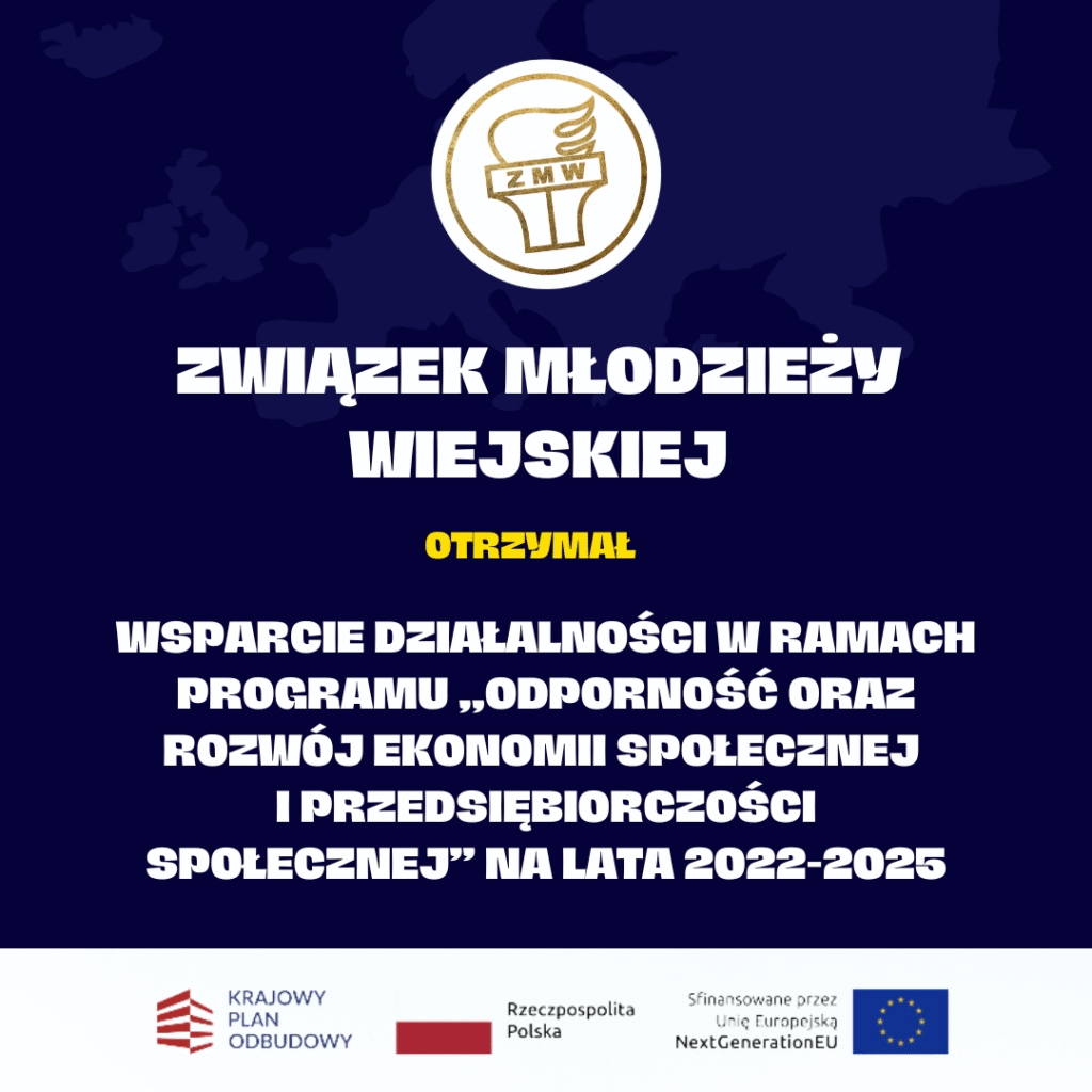 Z dumą ogłaszamy, że nasza działalność została objęta wsparciem finansowym w ramach Programu “Odporność oraz Rozwój Ekonomii Społecznej i Przedsiębiorczości Społecznej” na lata 2022-2025 r. Związek Młodzieży Wiejskiej uzyskał dofinansowanie na realizację zadania pt. “Podnoszenie jakości usług społecznych poprzez wzmocnienie potencjału Związku Młodzieży Wiejskiej”, którego celem jest wzmocnienie potencjału społecznego organizacji, w szczególności poprzez zakup sprzętu i urządzeń, pozwalających na wprowadzenie nowych usług i działań statutowych , co wpłynie na rozwój i utrzymanie atrakcyjności oraz wzrost konkurencyjności.